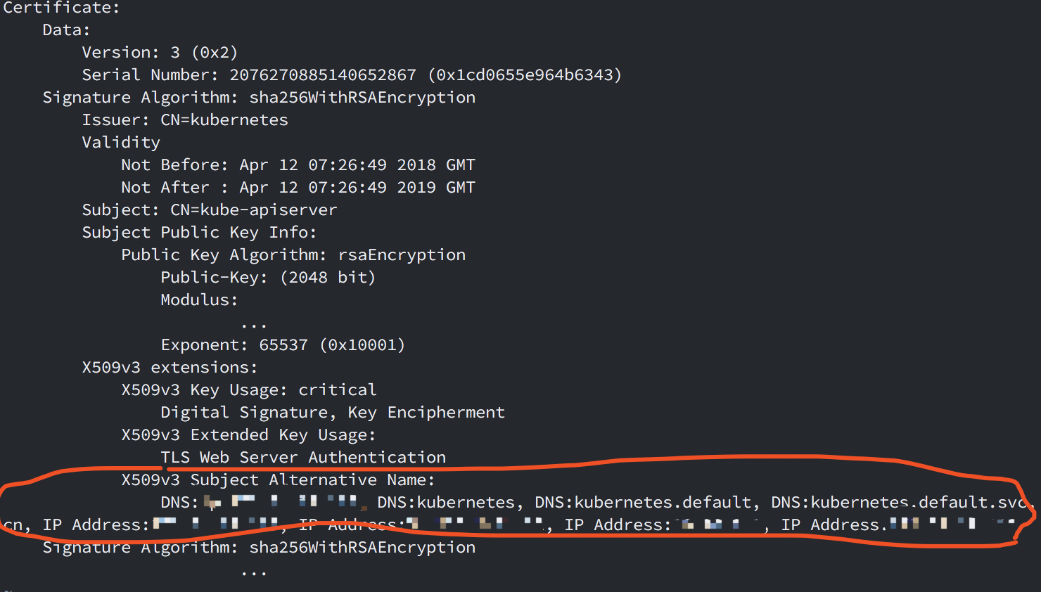 apiserver 的证书也是对的,马赛克的部分是我自己配的一些 IP 和 域名,和 kubeadm 配的一些 kube-dns 用的 overlay 网络上的 master 域名,其他 master 上的 components 也是类似的,在配高可用的时候要把每个 master 节点上的域名和 IP 都配上。kubelet 的证书也要配对,就在 join 里面介绍了,这个会用来鉴权 node 的身份。