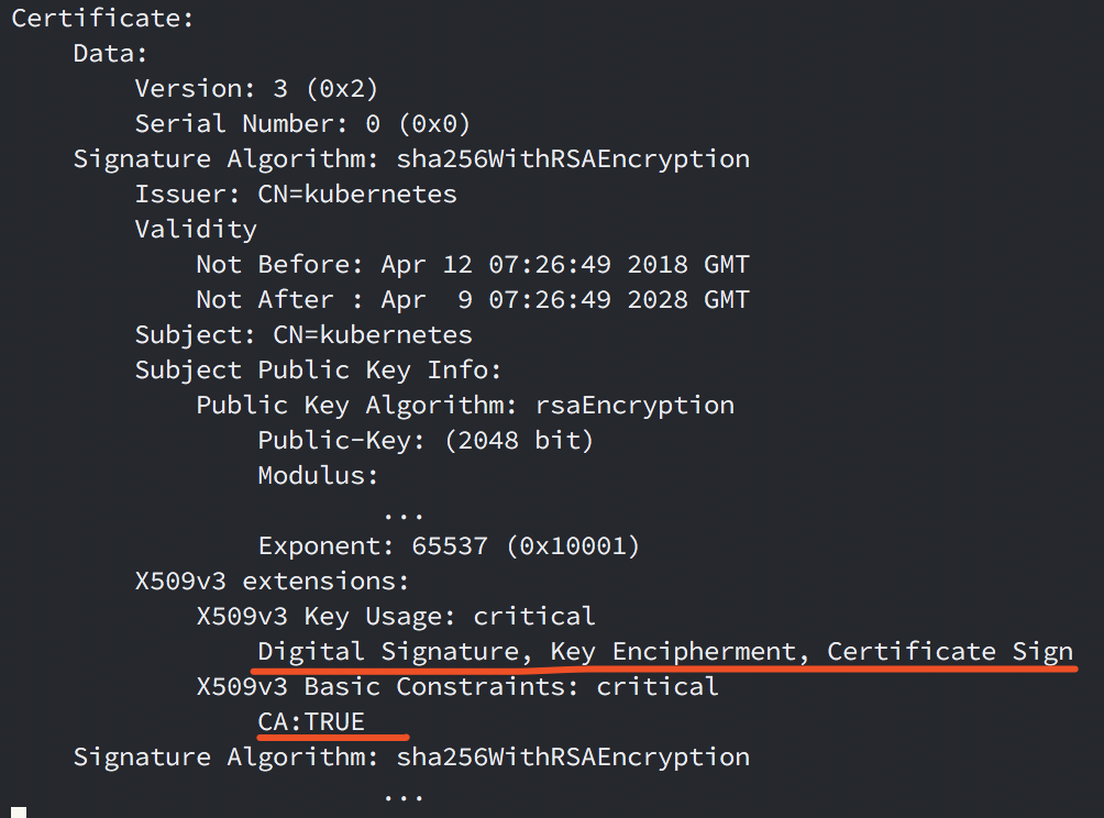 用 openssl x509 -in /etc/kubernetes/pki/ca.crt -text -noout 可以查看 ca 证书里面的内容,和我们看到的配置是一致的。