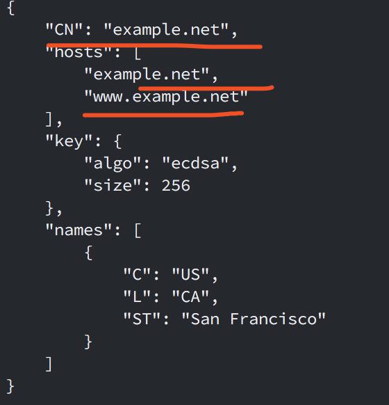 1 2 3 4 5 6 7 {     "CN" :  "client" ,      "key" :  {          "algo" :  "ecdsa" ,          "size" :  256      }  }