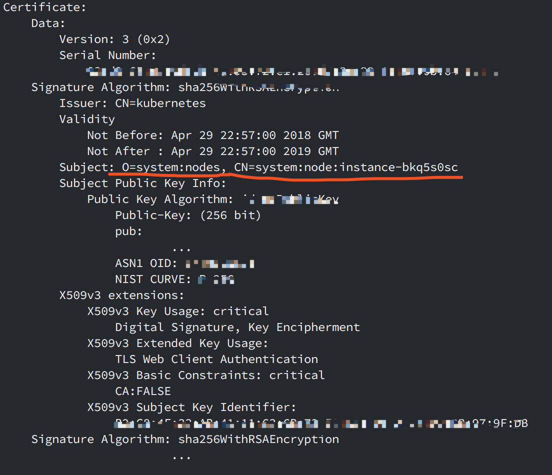 并且这个证书里面的 SAN 也是用来进行 Node 鉴权的身份确认的信息。用 openssl x509 -in /var/lib/kubelet/pki/kubelet-client.crt  -text -noout查看信息。