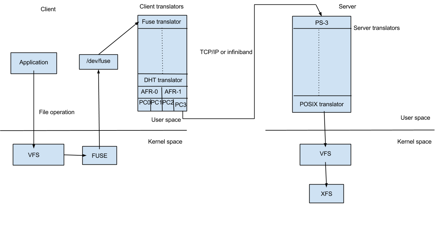 用户态是 fuse 实现的文件系统,通过网络协议走到 server,server 本身用的是本地的文件系统,glusterfs 推荐使用 xfs。