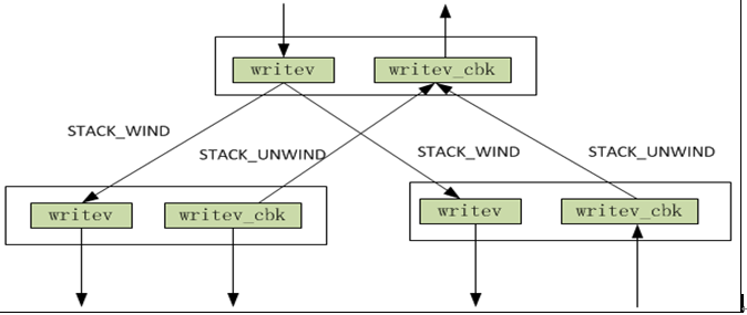 以 writev 举例,(write 的本质也是 writev,这里的 v 指的是内存向量,写的时候用链表表示的内存向量可以减少内存的拷贝,因为要分配一段连续的内存,然后拷到一起很没有效率,而且系统调用本身也支持这个系统调用,走到底层是硬件支持的,硬件不支持,也能 hook 帮你再拷贝到一起,但上层就不用管这些细节了),他们的调用关系通过 STACK_WIND 和 STACK_UNWIND 实现,对于所有的 xlator 的 op 都是这种调用关系,本身一层结束以后通过调用 STACK_WIND 调用下一层对应的 op,然后在调用完成之后通过 STACK_UNWIND 回调 op_cbk,并且这种调用关系是树状的。