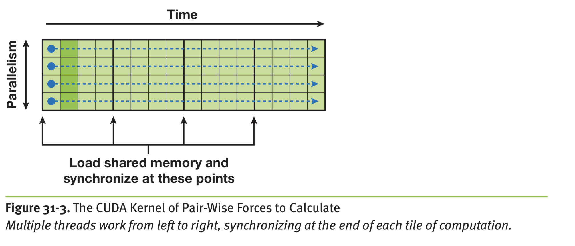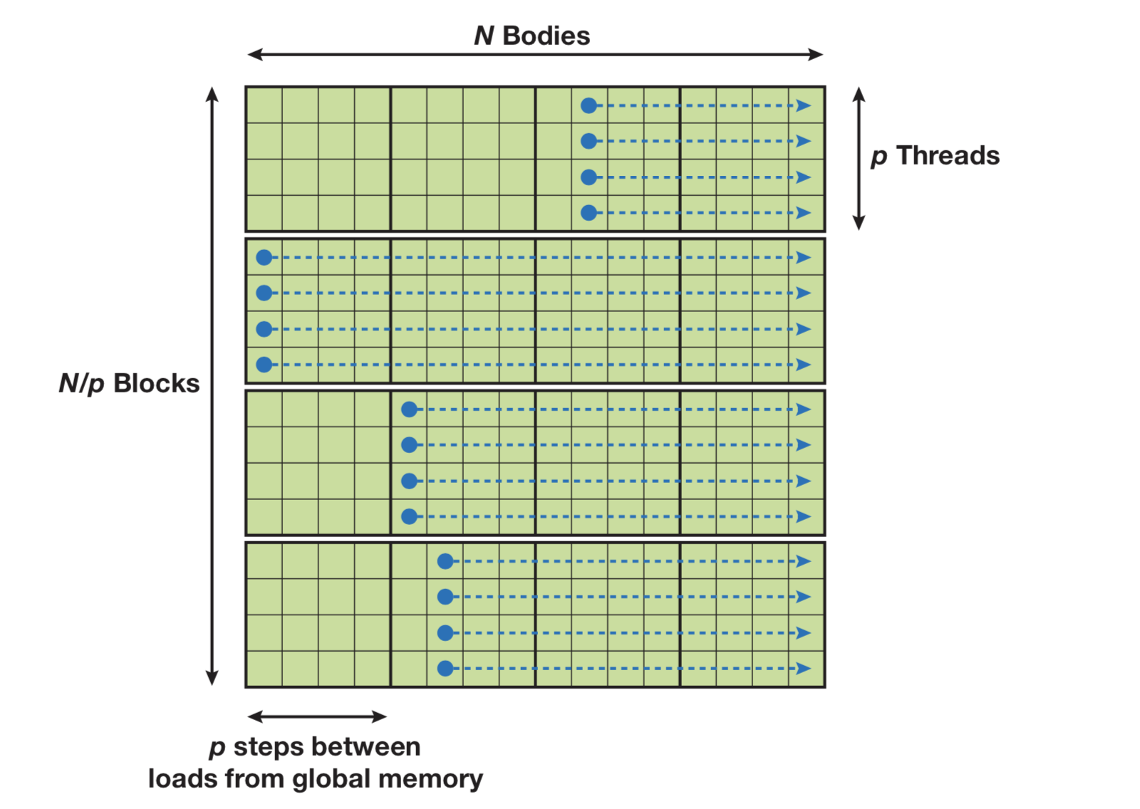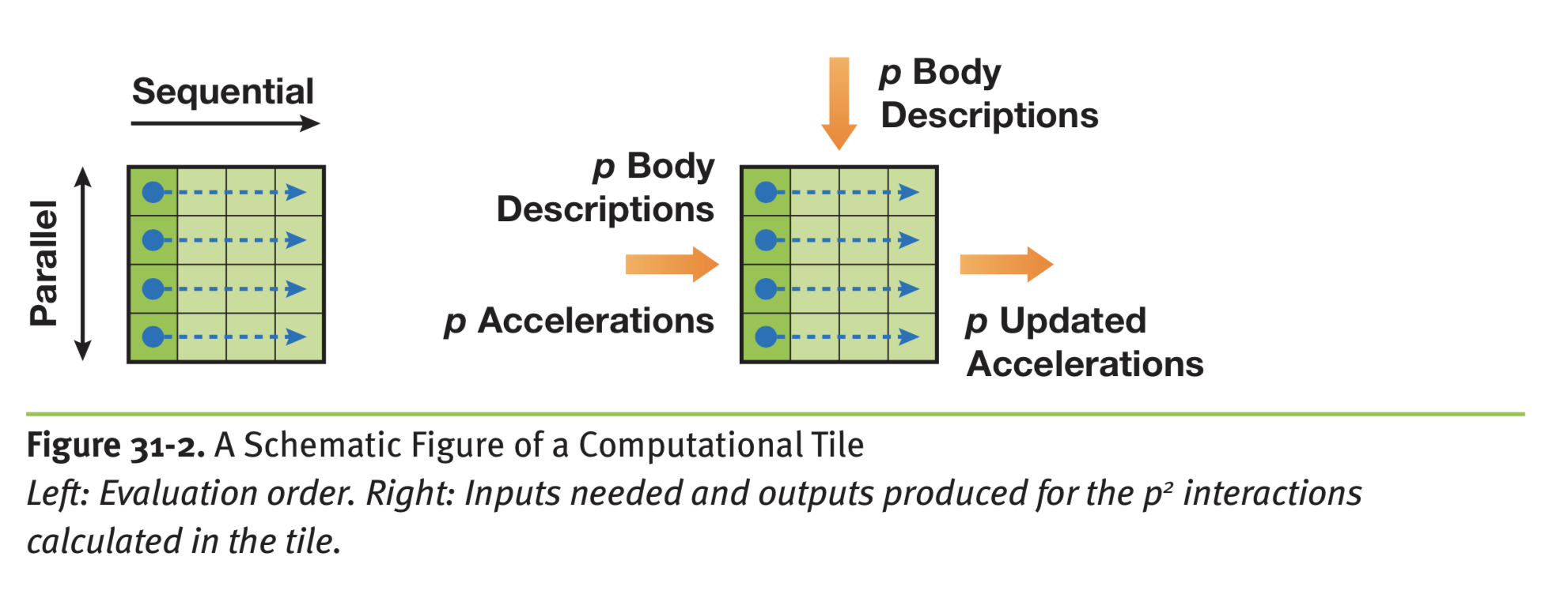 左侧表示一个 block 中的 p 个 body 执行 p 次,最后就能更新所有 body 的加速度,这里的内存占用是 O(p) 的不是 O(p^2),浅绿色表示的是串行执行的流,官方的文档没有更新,对应 CUDA 10 的例子里是这样的,vec3 存的是 x/y/z 轴的加速度,vec4 存的是坐标加质量,就是计算 i 受到 j 的加速度,这里没有并行设计是串行的。